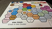 Just finished making a physical board and pieces. The pic shows the Coalition Building Phase of a later turn. Looking at the Cluster Map, the main portion of the board, we see that an exploration flee...